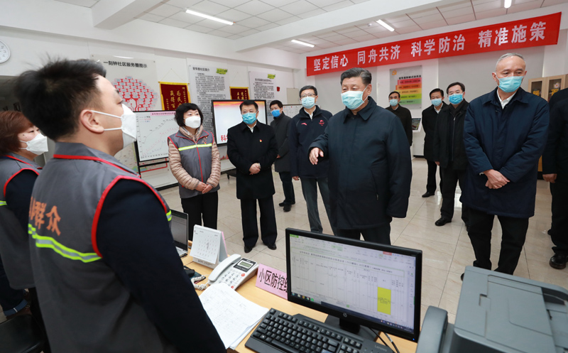 2月10日,中共中央总书记、国家主席、中央军委主席习近平在北京调研指导新冠肺炎疫情防控工作。这是习近平在朝阳区安贞街道安华里社区,了解基层一线疫情联防联控情况。
