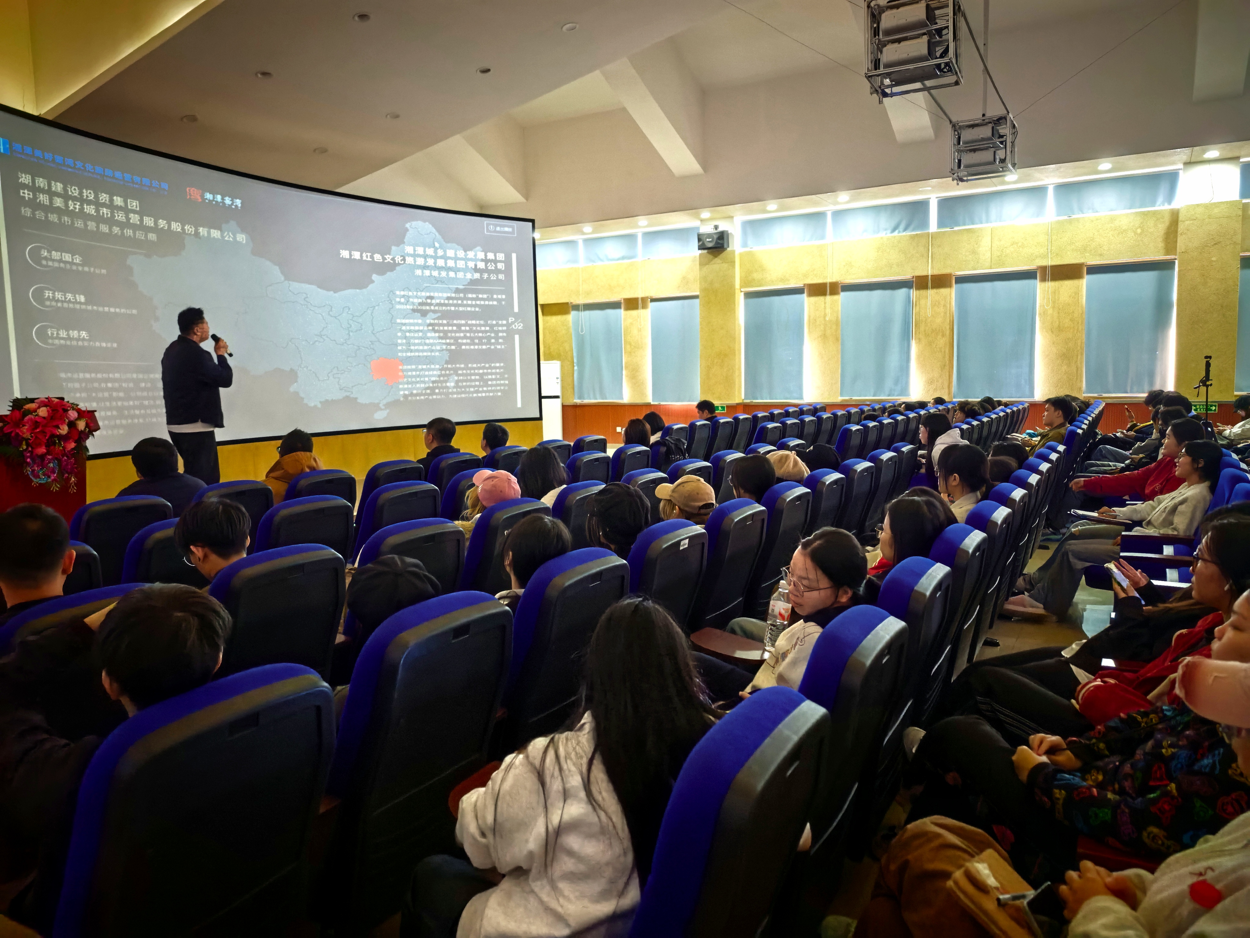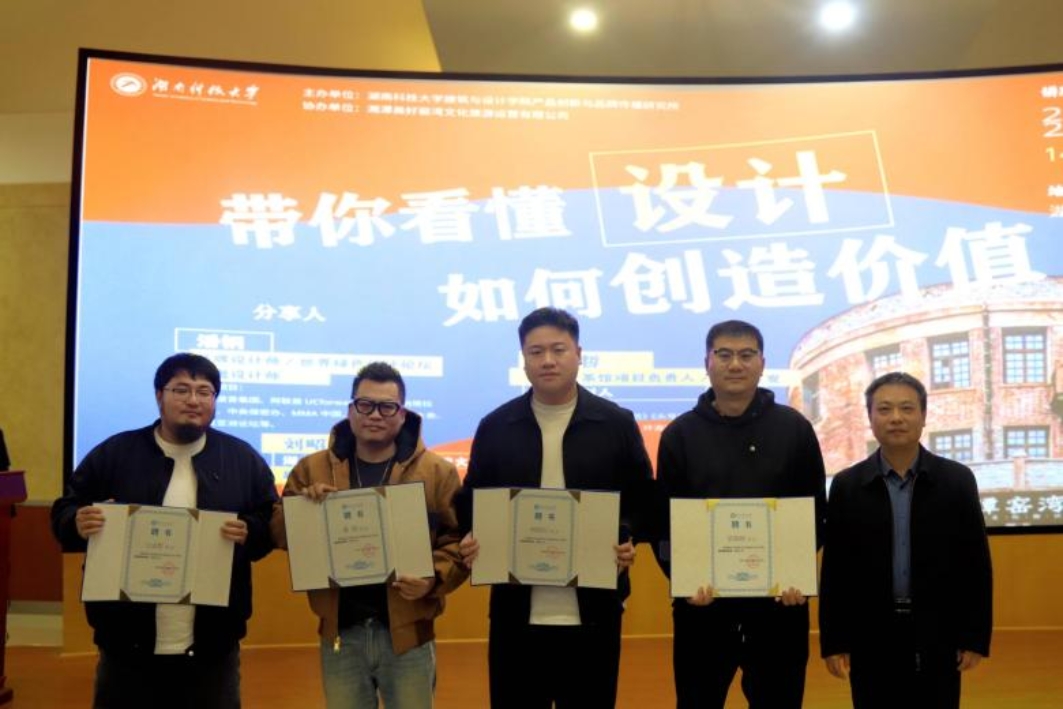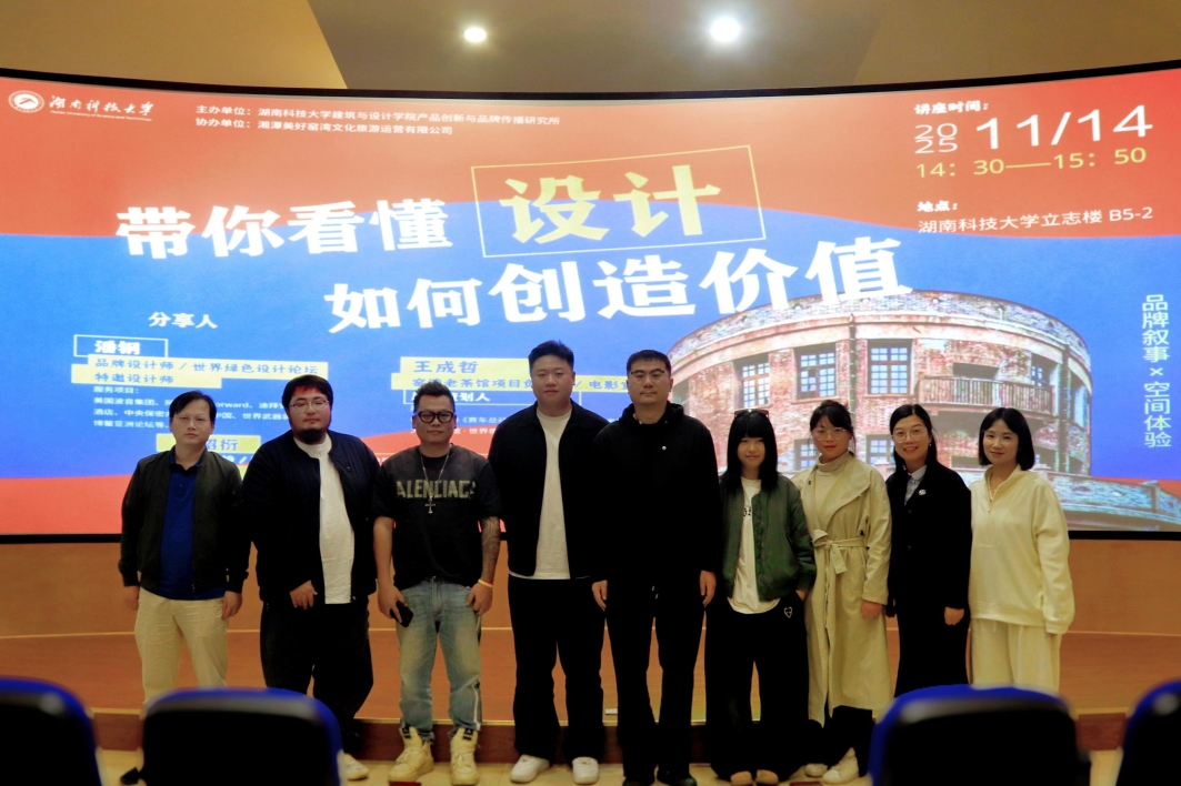 2025年11月14日下午2:30,“带你看懂设计,如何创造价值”主题分享会在立志楼 B5-2 拉开帷幕。本次分享会由湖南科技大学建筑与设计学院产品创新与品牌传播研究所副所长胡瑶主持,湘潭美好窑湾公司董事兼总经理景春晖、湖南建投/湘潭美好窑湾文化旅游运营有限公司副总经理刘昭衍、世界绿色设计论坛特邀设计师潘钢、窑湾老茶馆项目负责人王成哲等业界专家齐聚现场,建筑与设计学院党委书记余翰武教授、产品设计系主任吴寒副教授、视觉传达系主任姜太军副教授等老师以及23级产品设计专业的学生们共同出席,共同探讨设计价值与校企合作的深远意义,并探索如何通过实践教学提升学生的创新能力和实际操作技能。