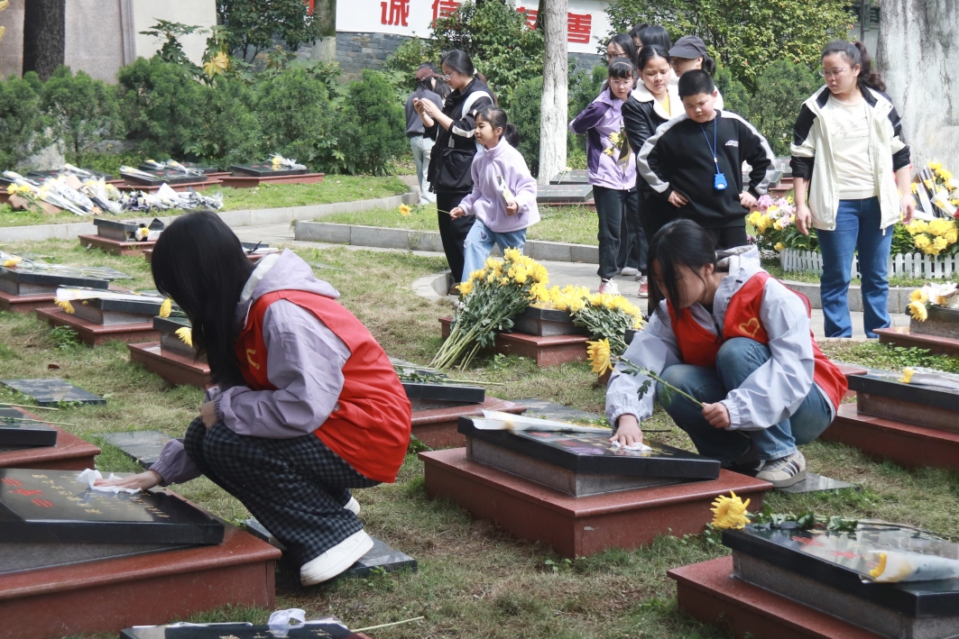 参观结束后,祭扫仪式在庄严肃穆的氛围中正式开始。大家在烈士纪念碑前肃立列队,神情庄重。他们依次缓步上前,将手中的鲜花轻轻敬献于烈士英名碑前,朵朵鲜花寄托着对先烈的追思,也承载着青年一代的传承之志。