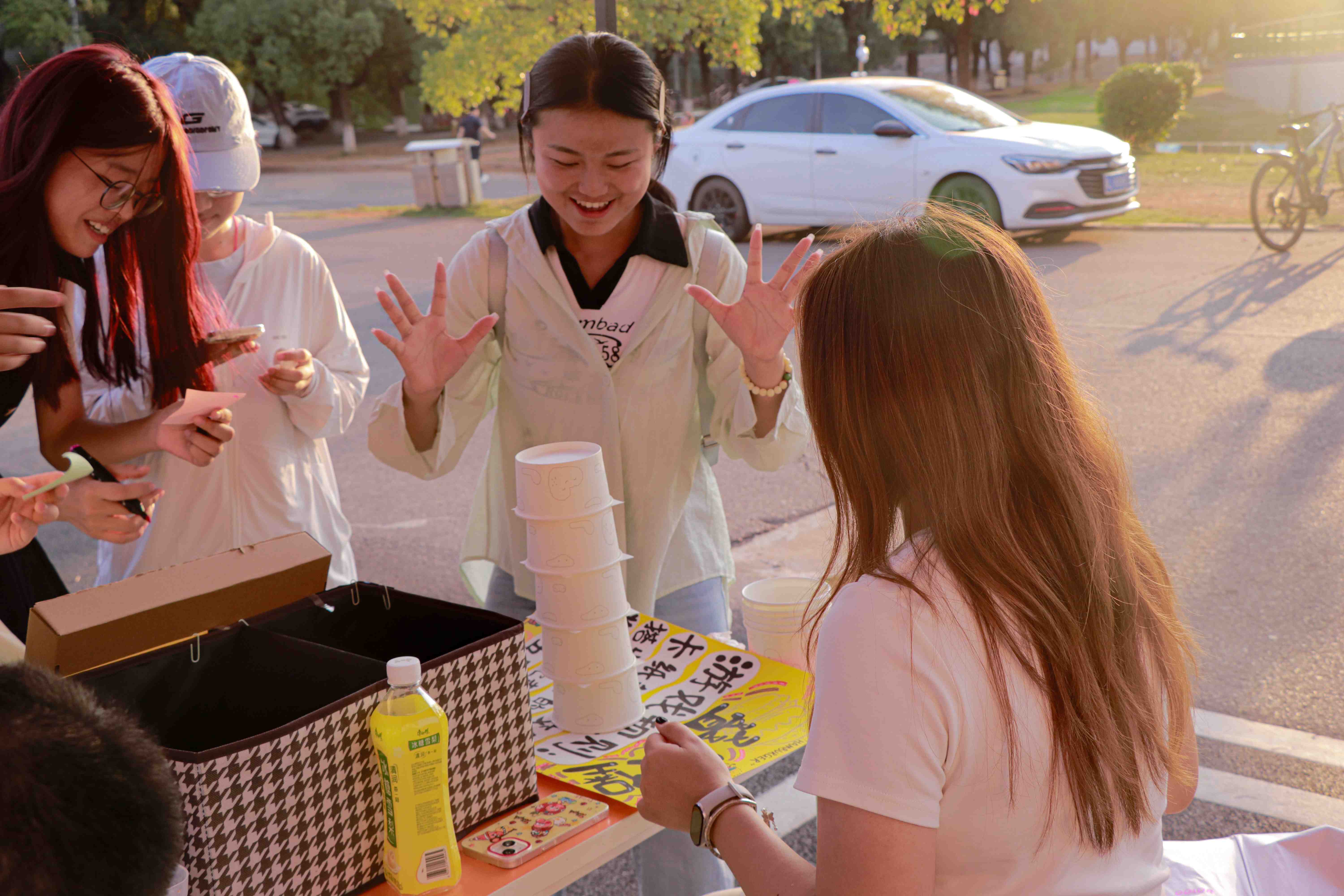 图:同学们体验“叠汉堡”心理小游戏