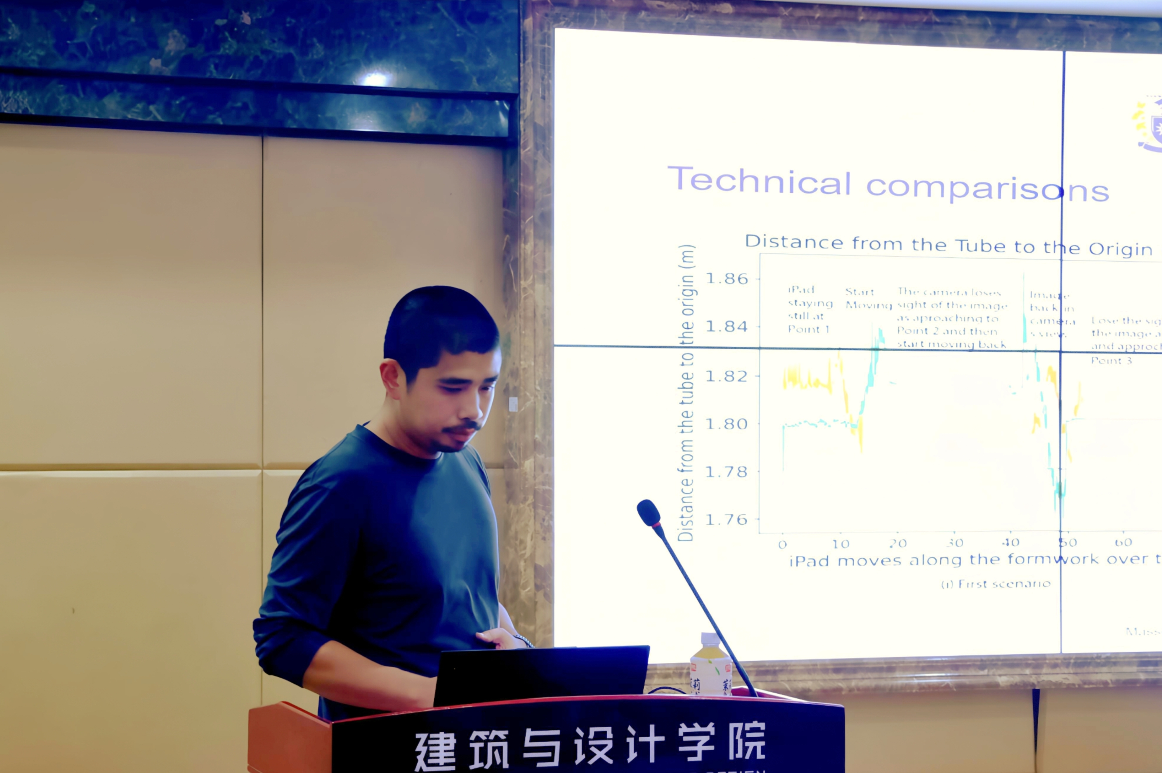 讲座中,冯哲楠围绕AR技术在建筑行业的应用现状展开分析。详细说明了AR国内外施工建造领域普遍存在生产力较低的问题。他指出,AR技术已在建筑设计、施工管理及现场安全等领域展现出显著潜力,但在异地施工场景中的应用研究仍存在空白。针对这一痛点,冯哲楠团队研发了手持式视频透视AR应用,专门用于预制混凝土板制造中的定位任务及在预制混凝土制造定位中的应用研究,验证了技术应用价值。