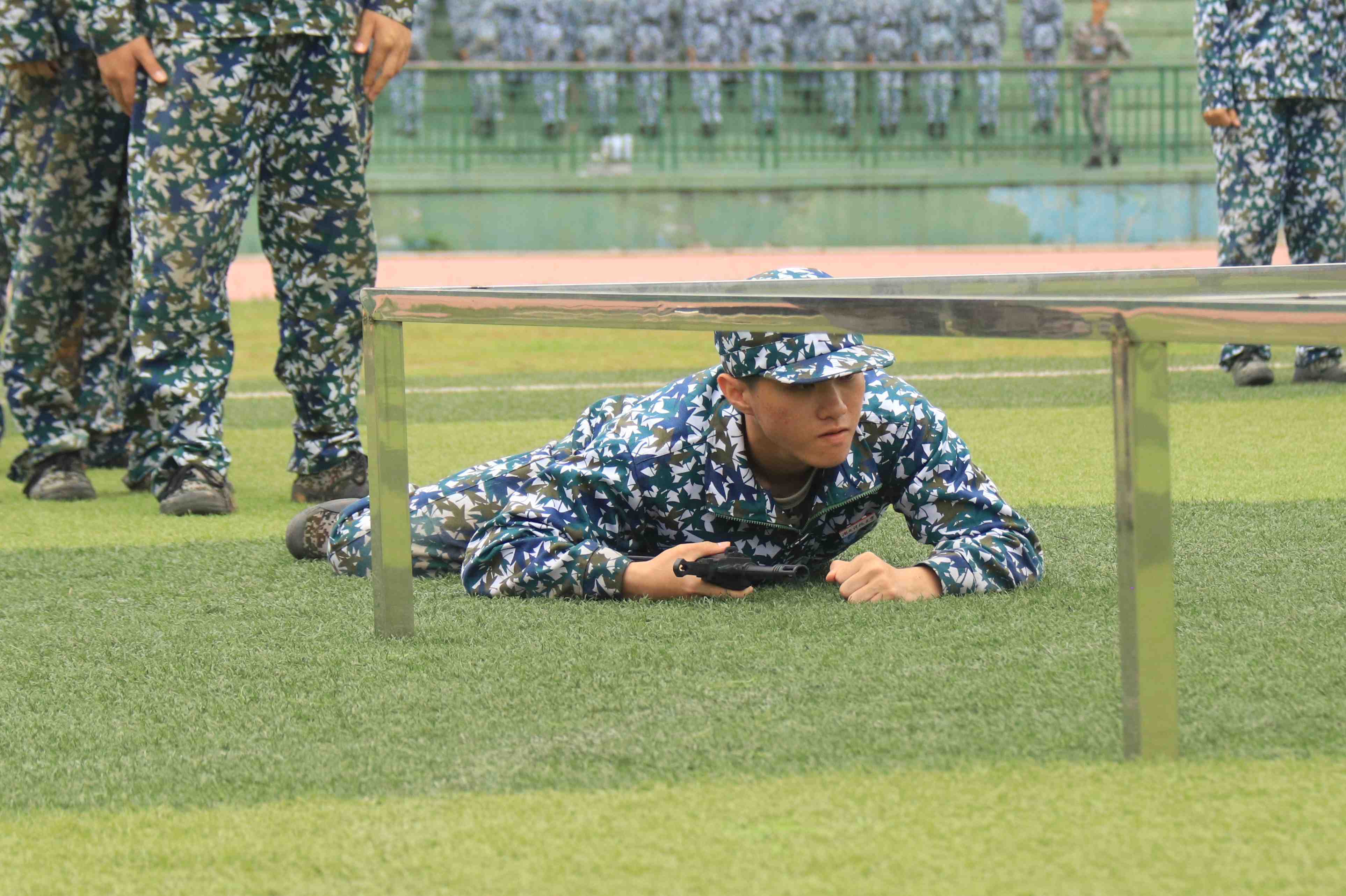 随着一声令下,参赛新生们迅速压低身姿,在模拟障碍物下展开匍匐前进的角逐。他们眼神专注、动作利落,在草坪上留下一道道青春的剪影。每一次匍匐,都是对身体极限的挑战;每一次前进,都是对意志品质的磨砺。